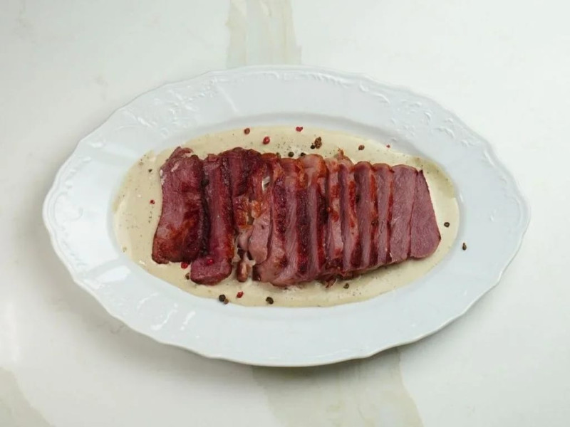 з рваною яловичиною - два яйця пашот, подаємо с голандським соусом та свіжим шпинатом з рваною яловичиною на булочці бріош