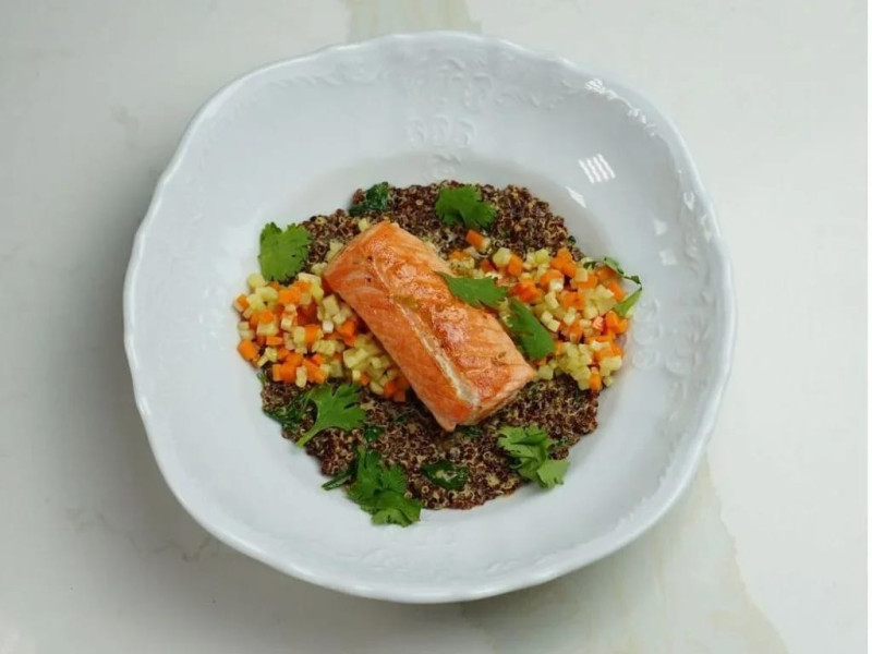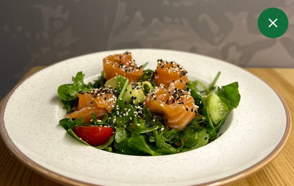 Салат руккола, свіжий шпинат, томати чері, печена молода картопля, перепелині яйця, тунець татакі та фірмова заправка з анчоусами