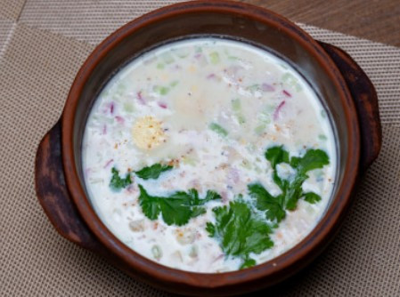 Насичений бульйон з грузинськими приправами, з м'ятою з часником, томатами, курдюком та картоплею.