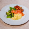 на солодовому хлібі з соусом чедер , солодкою кукурудзою, міксом зелені та яйцем пашот