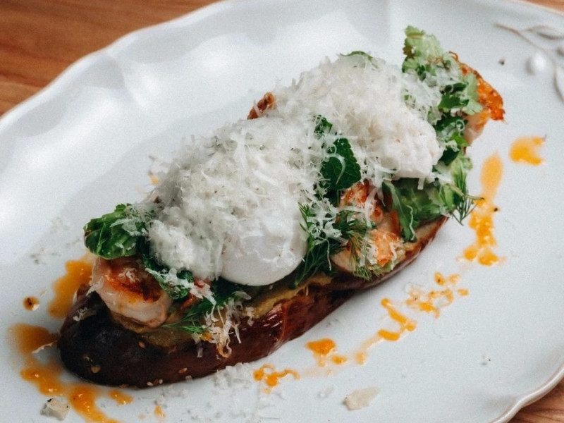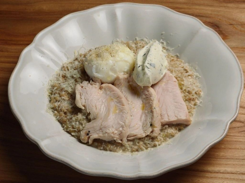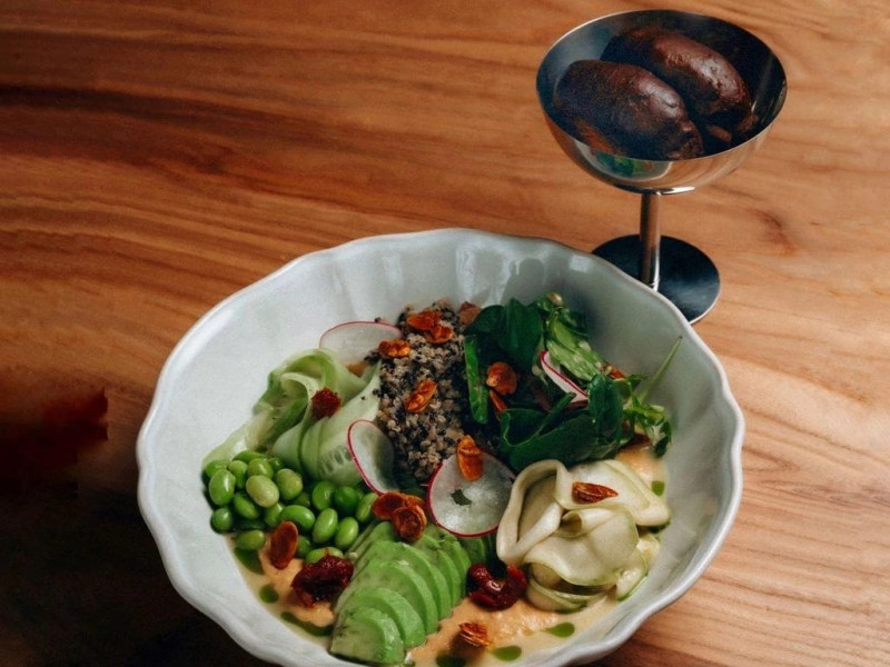 Поживний вегетаріанський боул на основі теплої кіноа, звареної на овочевому бульйоні. Доповнений ніжним хумусом, маринованим кабачком, свіжим огірком, авокадо, в’яленими томатами та едамаме. Подається з міксом салату, редисом, фірмовою заправкою, зеленим маслом і бородинським хлібом