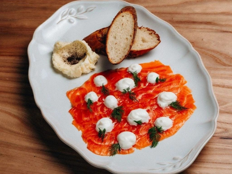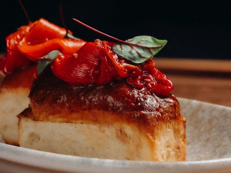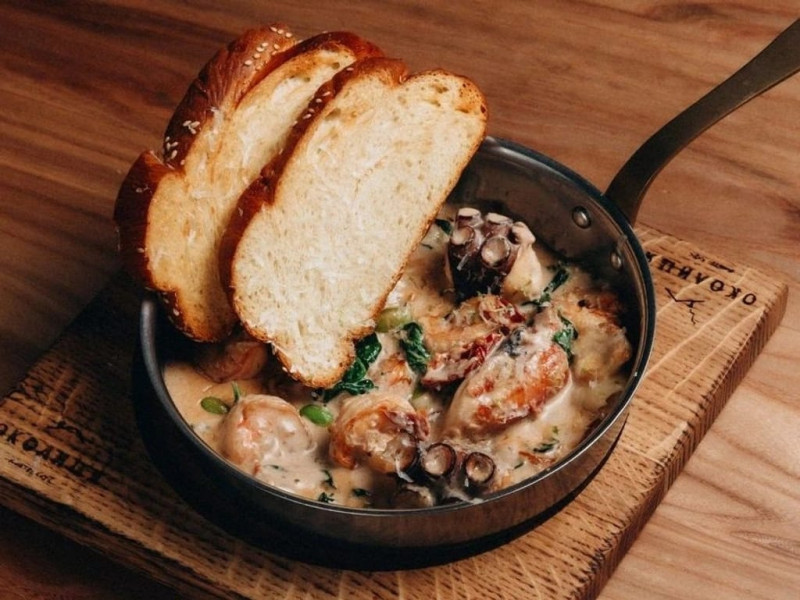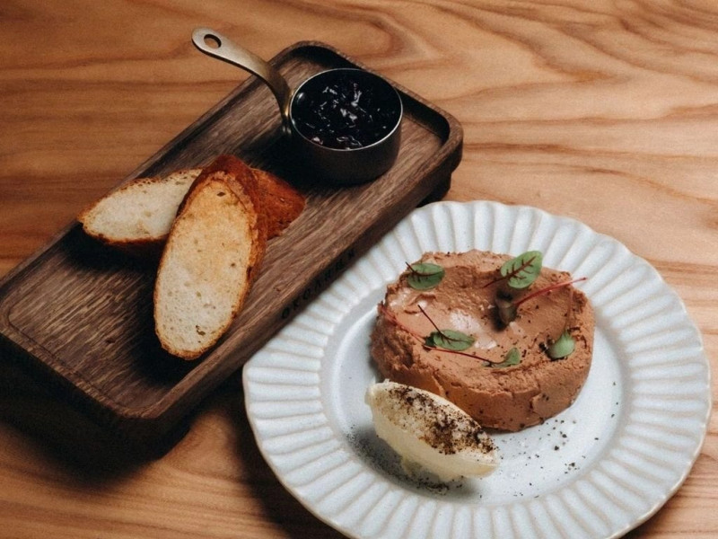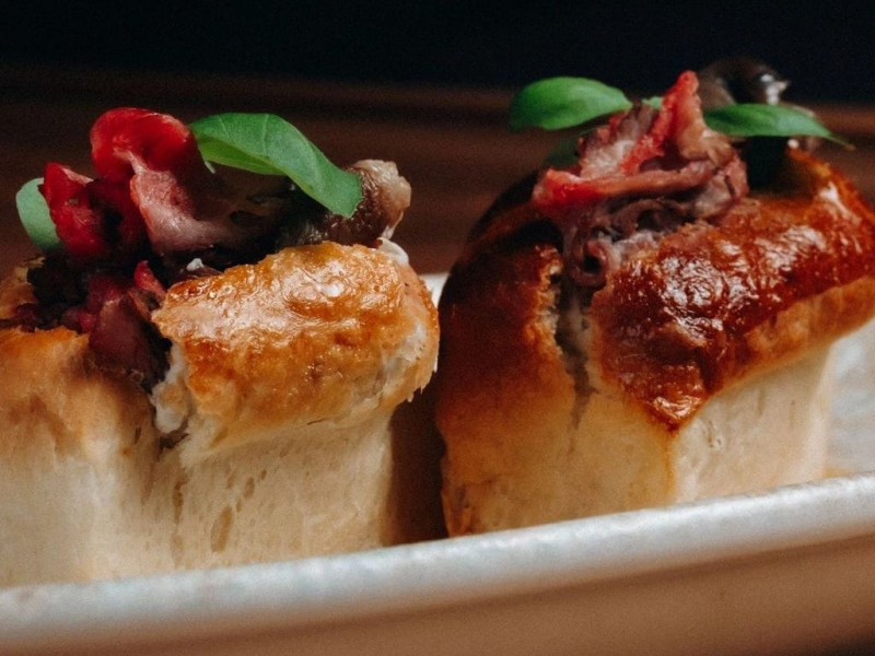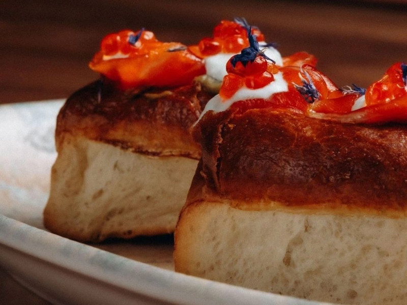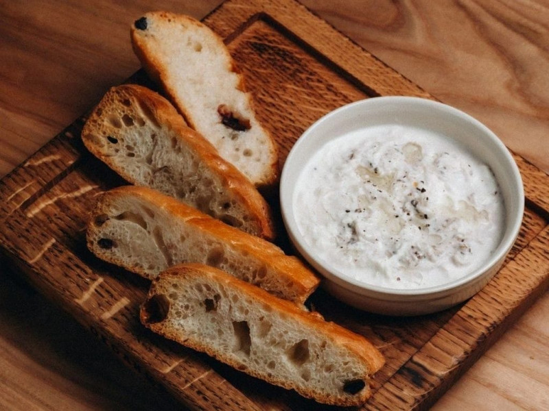 Добірка свіжоспеченого домашнього хліба: цибулевий багет, бородиньський , хала та пампушки , подається зі збитим вершковим маслом.