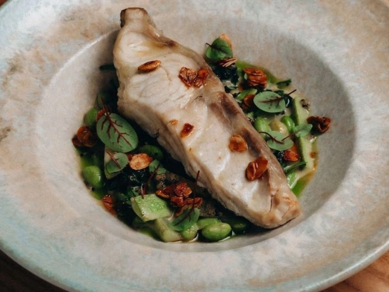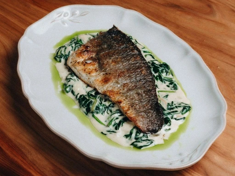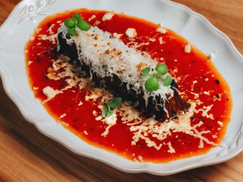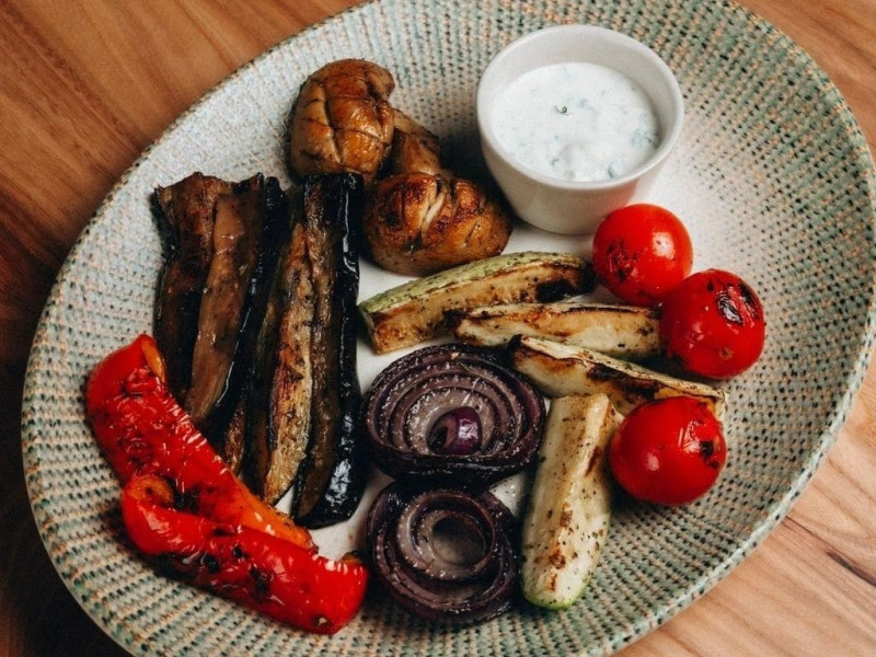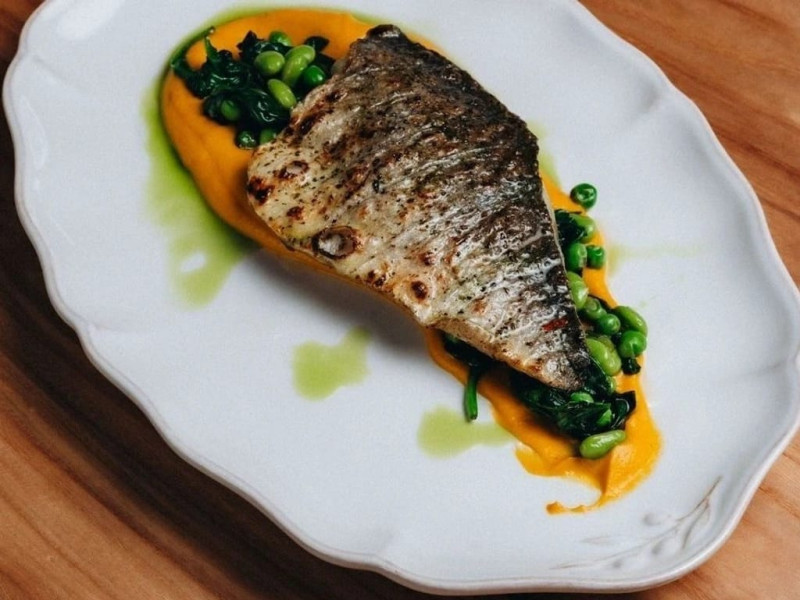Ніжний восьминіг на грилі з пюре з батату та овочевою сальсою