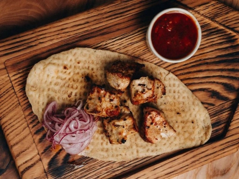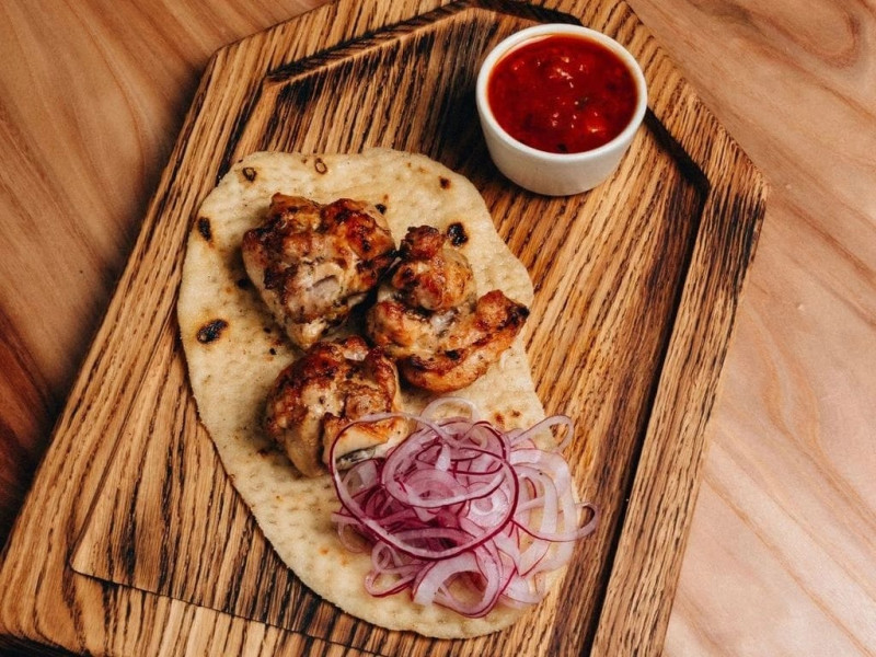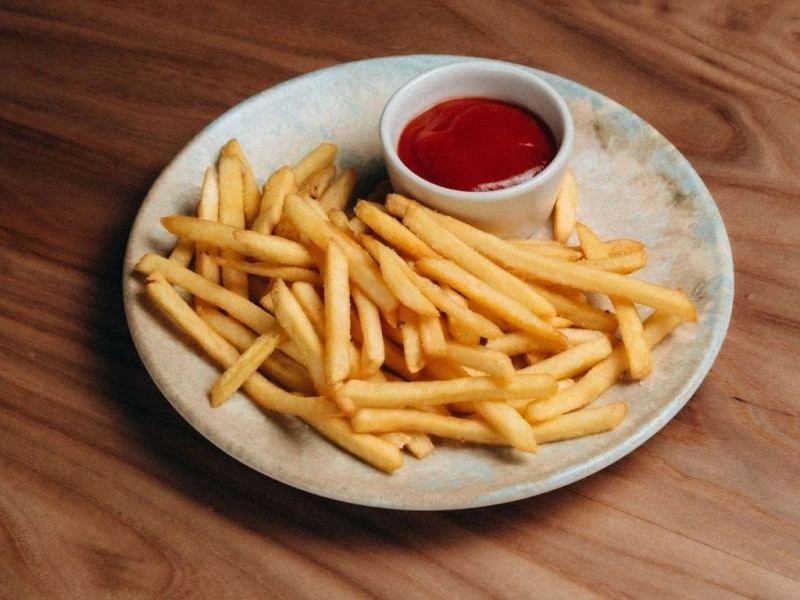 Ніжний шашличок з індички з картоплею фрі та кетчупом