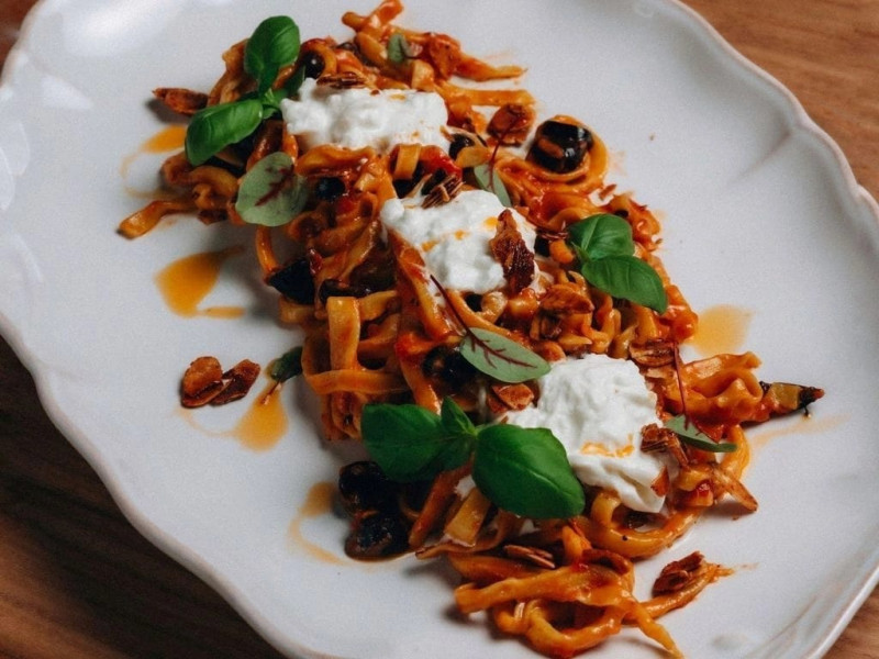 Свіжі овочі, мус із фети, оливки та ароматні трави у середземноморському стилі.