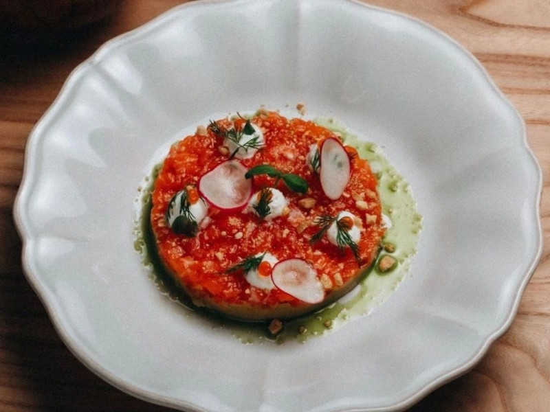 Салат з авокадо та хурмою, з трюфельними нотами, цитрусовим маслом та сиром пекоріно