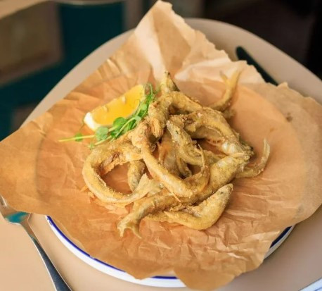 Хамса чорноморська, барабуля, сарган, ставридка, мойва, карась, картопля фрі, соуси сирний, вітело та кетчуп