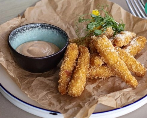 Креветки Панко, кільця кальмара в клярі, рибні палички, соуси сирний та спайсі