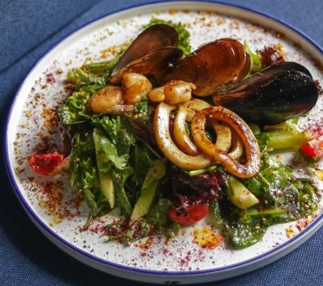 Мідії в мушлях, рапан, кальмар, морський гребінець, тигрова креветка, восьминіг бебі, соус на вибір