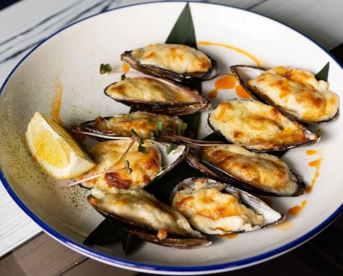 Чорноморські мідії у мушлях ми готуємо у вершковому соусі з м'яким сиром та білим вином, часником, селерою та цебулею порей. Подаємо з білими грінками