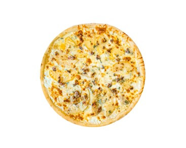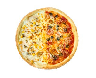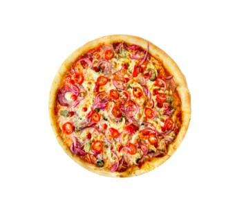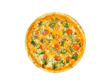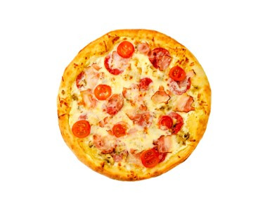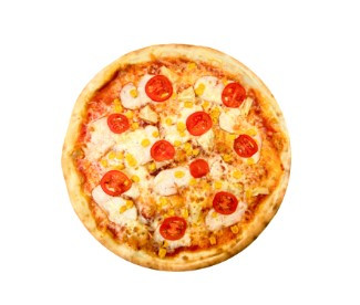 з куркою - курка копчена, помідор, кукурудза консервована, сир Моцарела, соус томатний