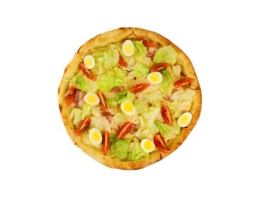 з ковбаскою - ковбаски Мисливські, помідор, кукурудза консервована, сир Моцарела, соус томатний