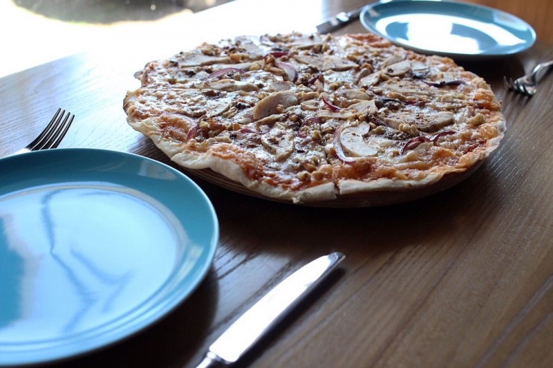 пицца-соус, соус "Цезарь", сыр Моцарелла, курица, бекон, листья салата, Пармезан
